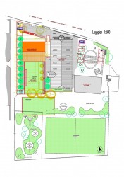 Der durch die Erweiterung städtebaulich definierte Außenraum wird als Pausenhof gestaltet. Unterhalb desselben ist die Errichtung der neuen Turnhalle vorgesehen.