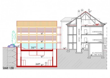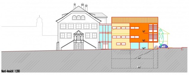 Der neue Erweiterungsbau an der Stelle der abzubrechenden Turnhalle (wurde erst später dazu gebaut) besitzt 3 oberirdische und 2 unterirdische Geschosse. Als Bindeglied zum historischen Altbau ist ein Glaskörper vorgesehen, welcher als Haupteingang konzipiert wurde.