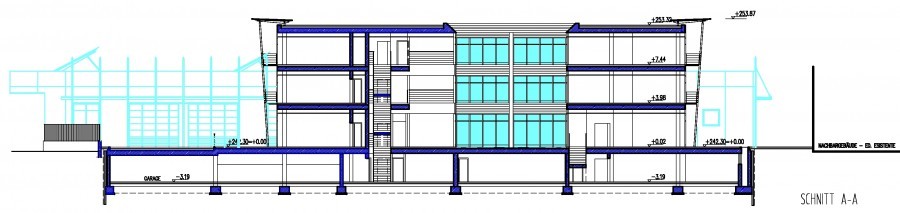Diese Tragstruktur auf drei Seiten des Baukörpers verleiht dem Gebäude zusammen mit der Alu- Vorhangfassade und den großflächigen Verglasungen eine optische Leichtigkeit, eine hohe Transparenz und gewährleistet eine gute Belichtung.