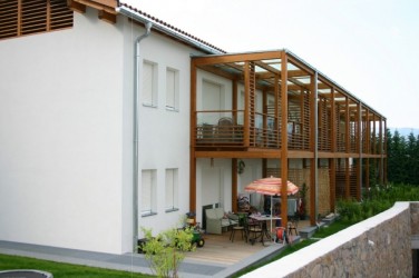 Die Erschließung der einzelnen Gebäude erfolgt über vorgelagerte Außengänge und -treppen und ist von den Wohnbereichen thermisch getrennt. Dasselbe Prinzip gilt auch für die vorgesetzten Balkonkonstruktionen.